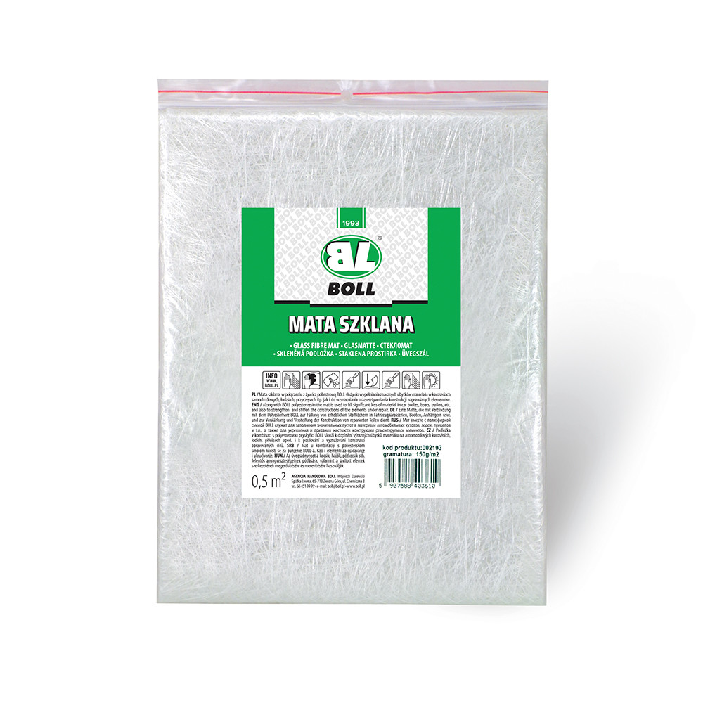 Mata w połączeniu z żywicą poliestrową BOLL służy do wypełniania znacznych ubytków materiału w karoseriach samochodowych, łodziach, przyczepach itp. jak i do wzmacniania i usztywniania konstrukcji naprawianych elementów. Dostępne gramatury: 150, 300, 450g/m2. Wymiar 0,5m2.
