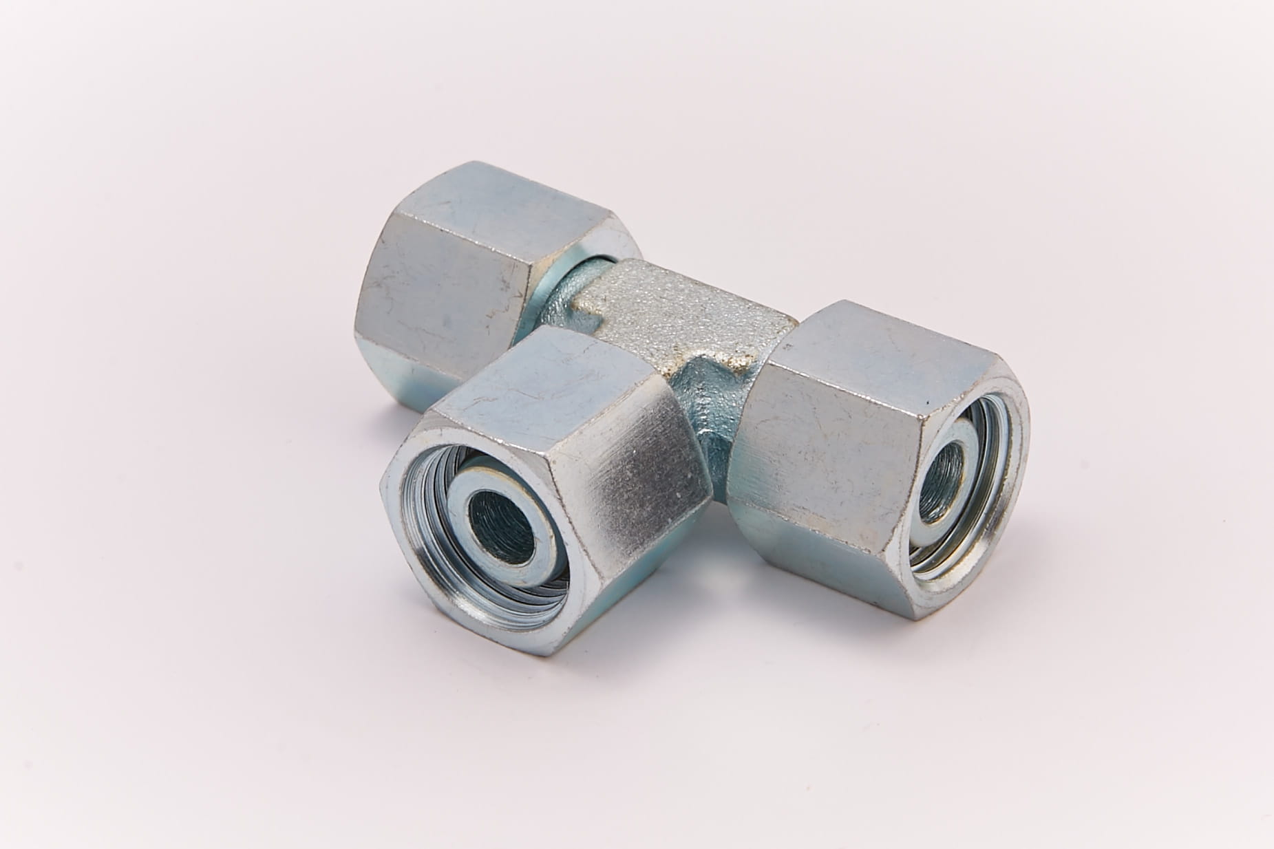 Złączka hydrauliczna trójnikowa z 3 nakrętkami, 3 x gwint wewnętrzny metryczny z nakrętką i pierścieniem uszczelniającym - o-ringiem na stożku 24°